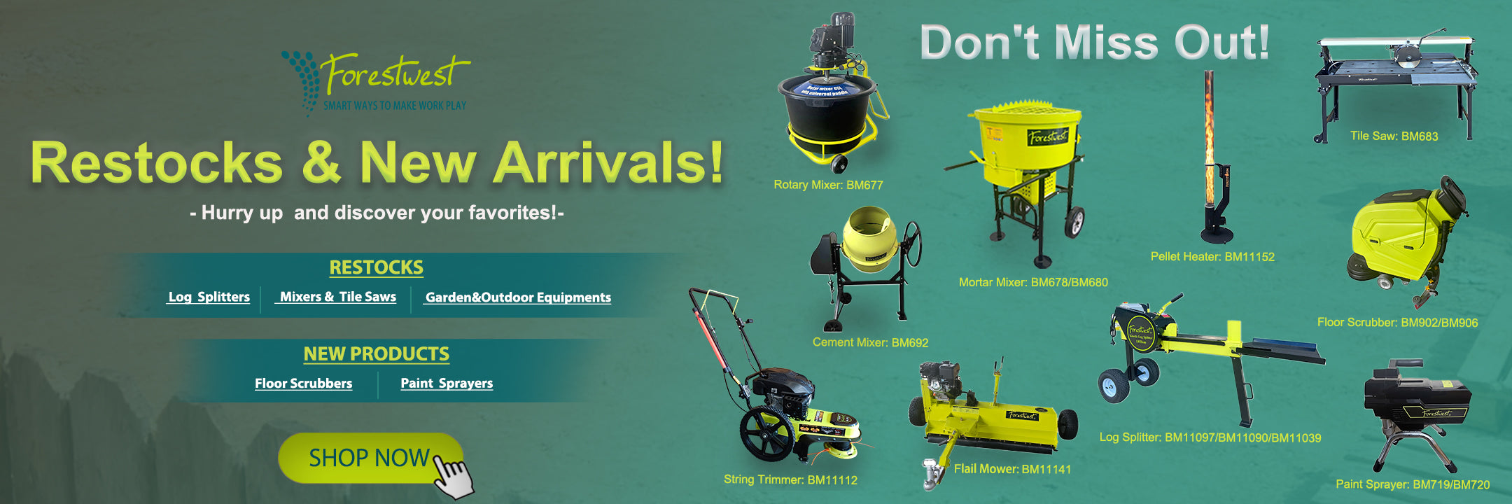 Cement Mixer, Mortar Mixer, Dumper, Tile Saw, etc.